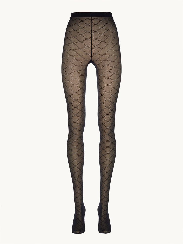 These tights feature a delicate jacquard net effect pattern with a sophisticated matte finish, held in place with a soft, knitted-in waistband for a comfortable and secure fit. The material is sustainably dyed and composed of ninety-six percent polyamide and four percent elastane.