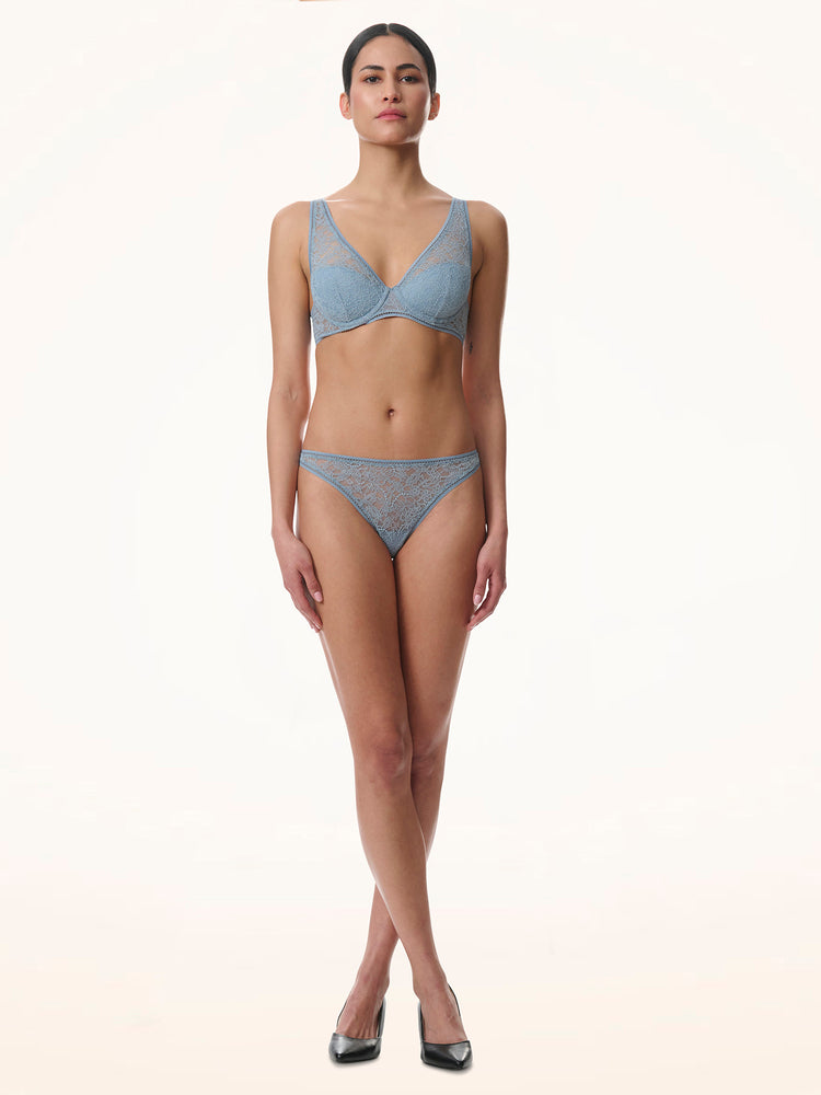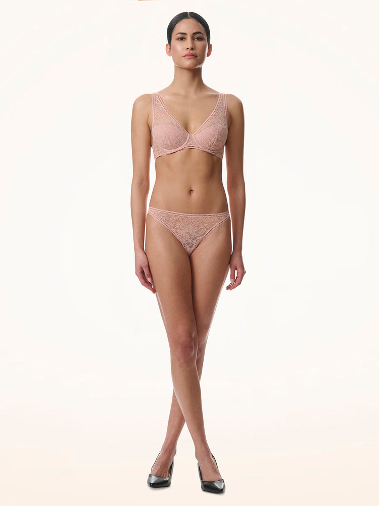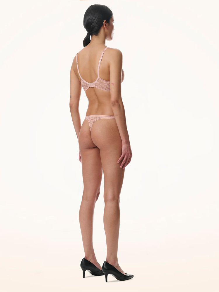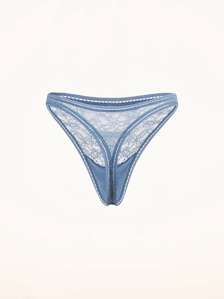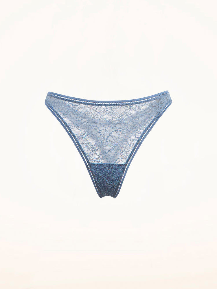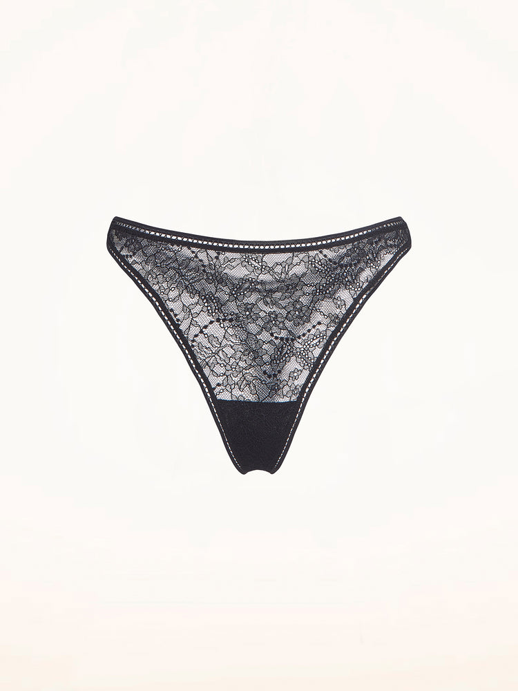 This piece features a low waist and zero back coverage for a barely-there feel, crafted from recycled stretch lace with an intricate organic foliage motif and geometric criss-cross finishing details.
