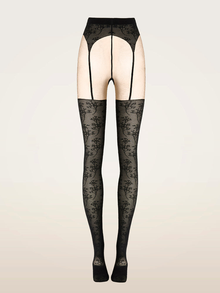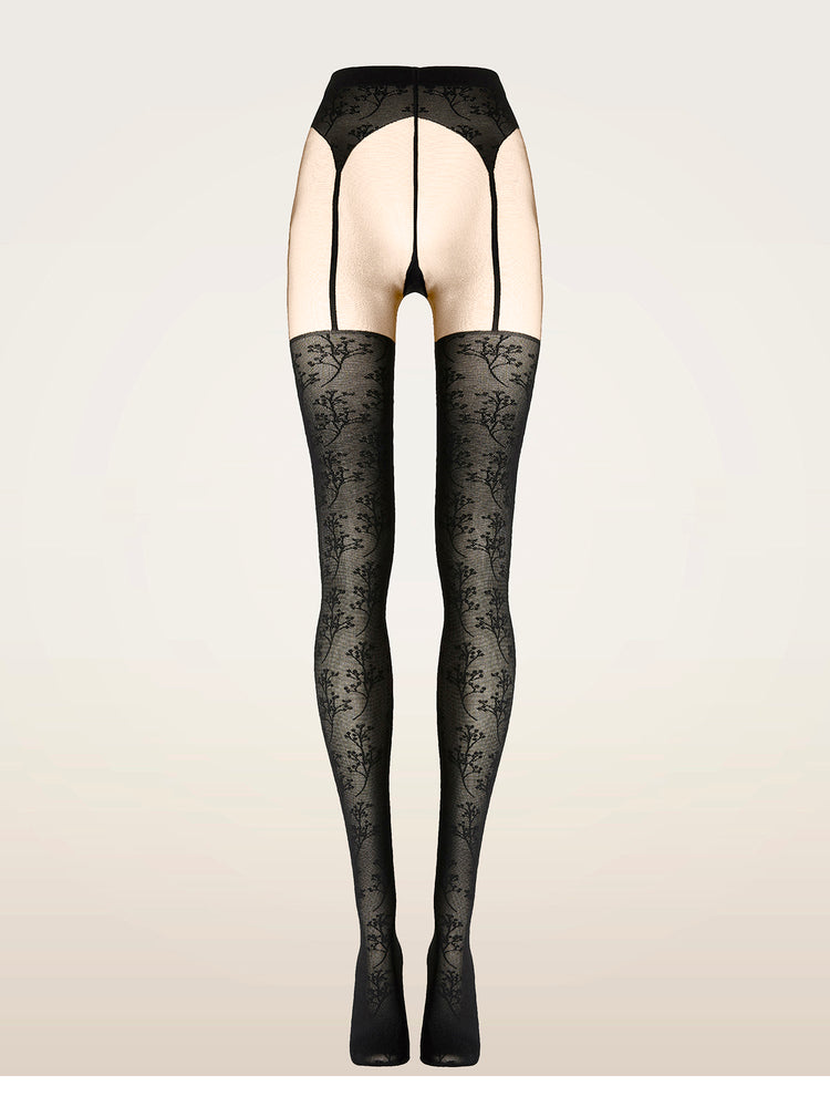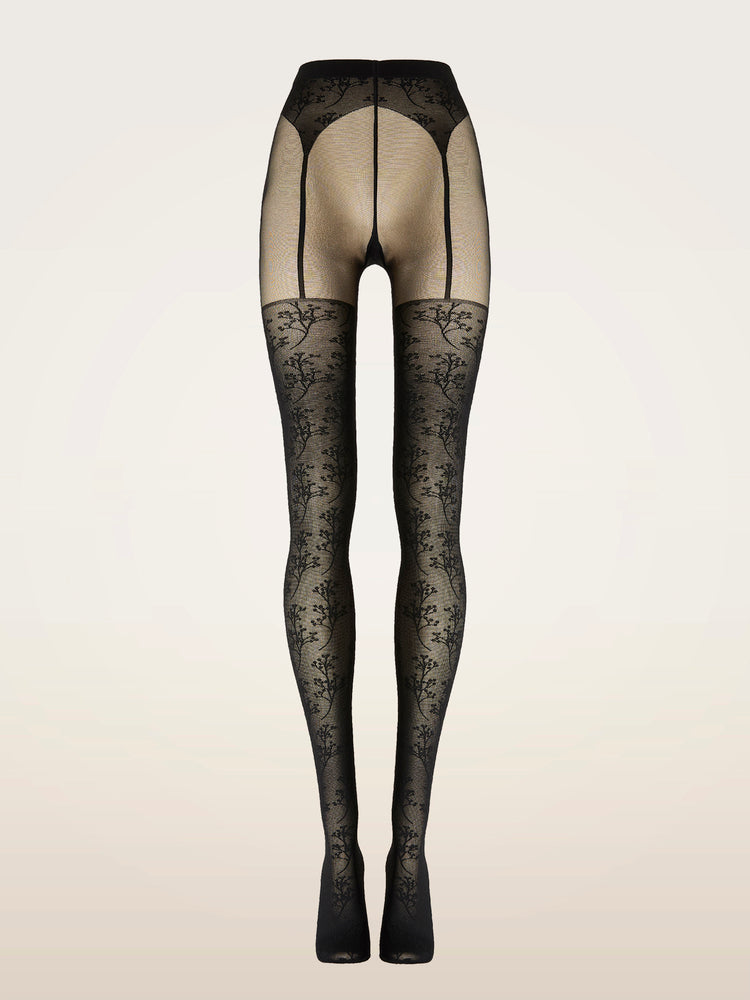 These tights feature a seamless circular knit with a floral pattern that blends sheer and opaque effects, creating the illusion of stockings styled with a garter belt. The twenty-denier construction offers a soft, matte finish with a comfortable knitted-in waistband.