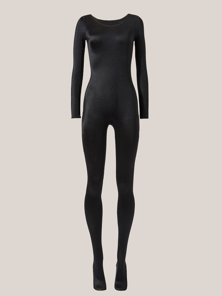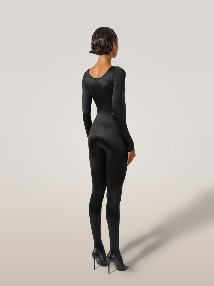 Crafted from an extremely elastic, fully opaque stretch jersey with a luxurious shimmery finish for a show-stopping look.