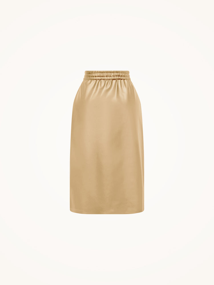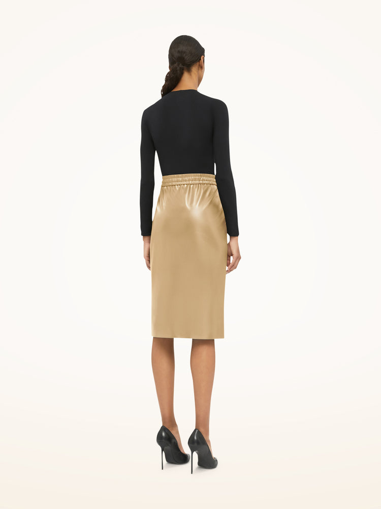 This skirt features a loose, relaxed fit with a gathered elastic waistband for ultimate comfort and ease. The over-the-knee length and bonded hemline create a clean, modern silhouette that drapes beautifully.