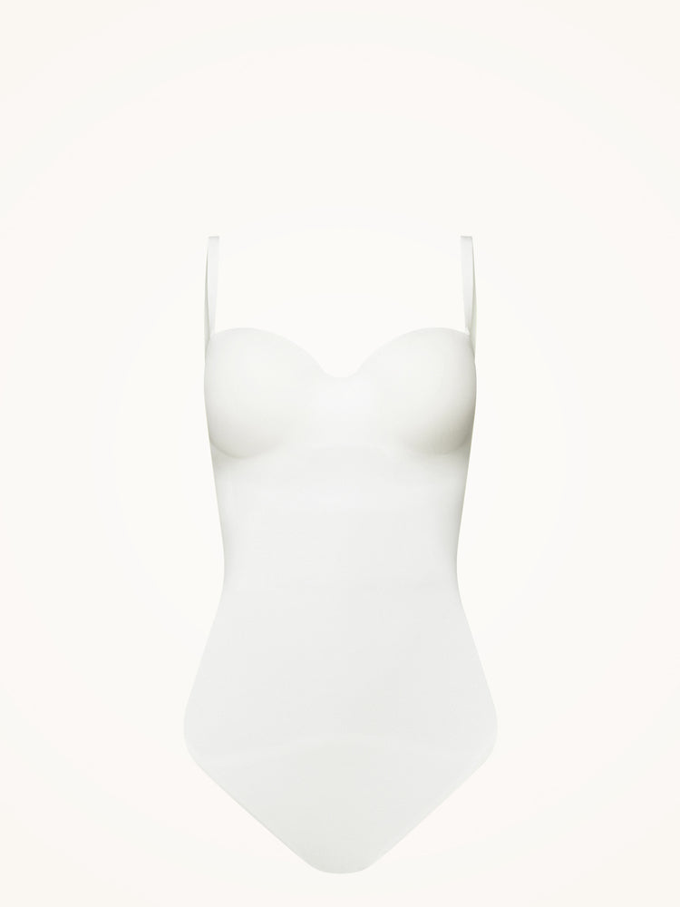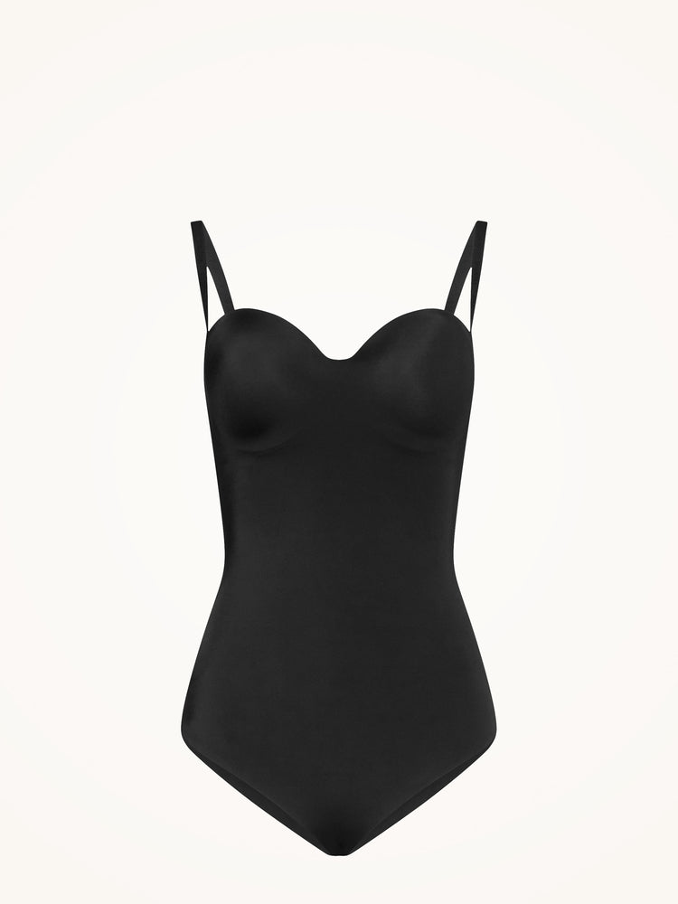 This piece features strong shaping and an integrated bandeau bra for a secure, elegant fit, with adjustable and removable straps for versatile styling.