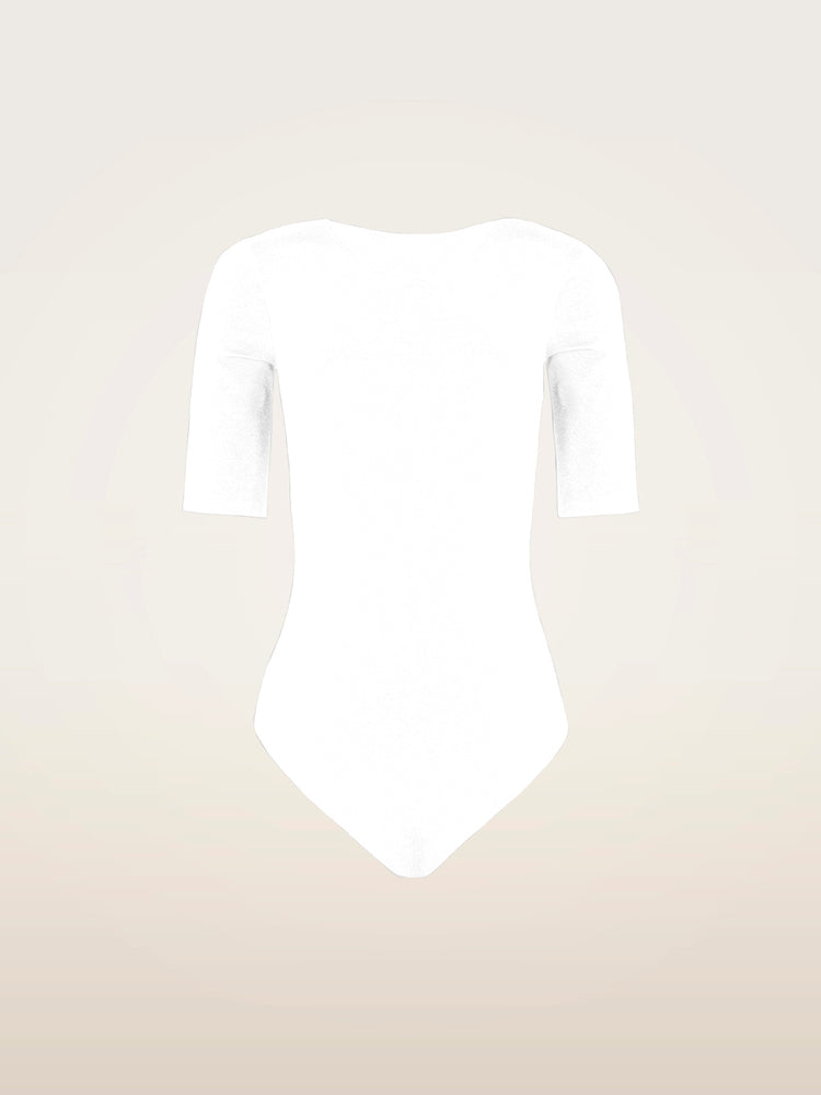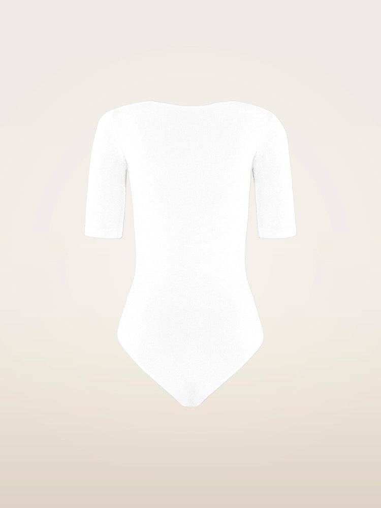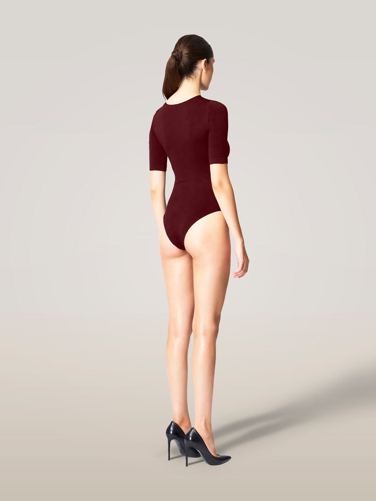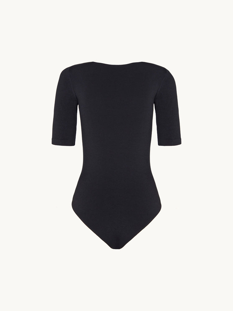 Slim and seamless, this short-sleeved bodysuit stays perfectly in place with hidden elastic tape along the scoop neckline, featuring a shiny exterior lined with a soft cotton blend, a round neck, short sleeves with knitted-in hems, and a Brazilian bottom with a snap closure.