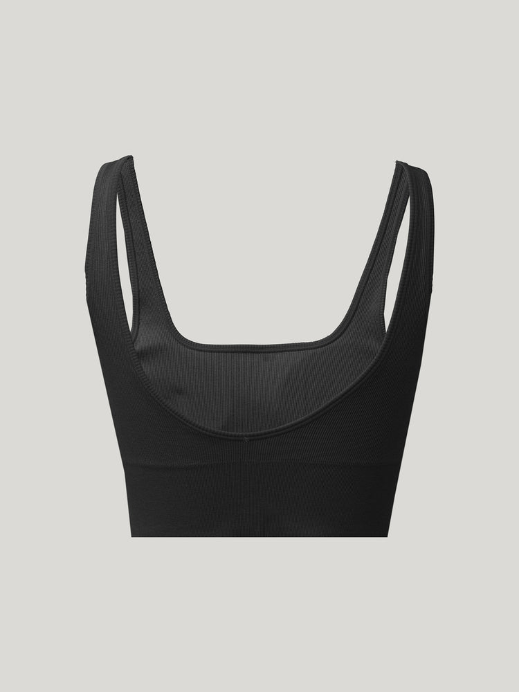 This seamless sports bra features a dual scoop neck front and low back with a hardware-free, pull-on closure. A wide rib bottom band and moisture-wicking, double-layered fabric provide smoothing and subtle support, ensuring comfort and a flattering fit.