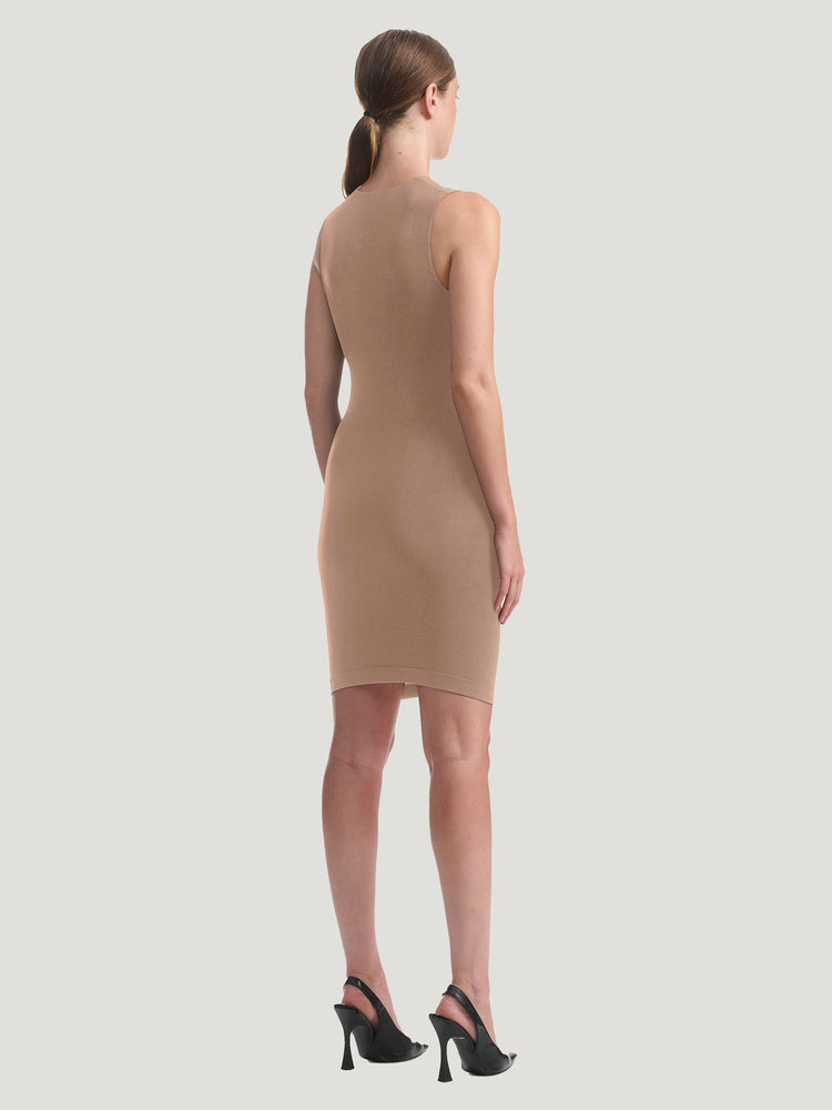 This wide shoulder dress features built-in side tapering panels for light shaping and an all-over smoothing effect. The deep neckline and stretch fit ensure comfort and a flattering silhouette.