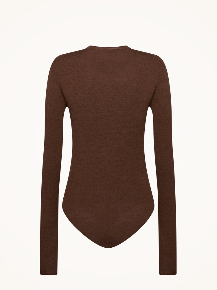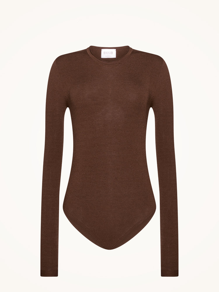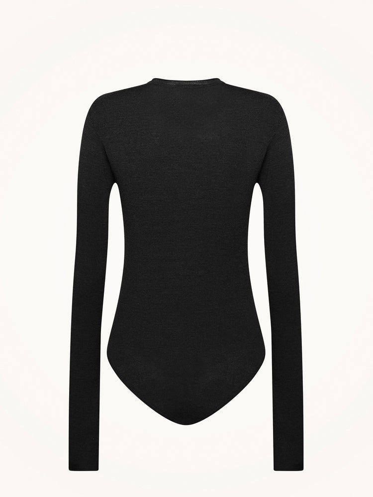 This long-sleeved bodysuit is knitted in one piece for a seamless, slim fit, featuring a round neck and snap closure for easy wear. The fabric is a soft blend of virgin wool and polyester, offering natural comfort and stretch.