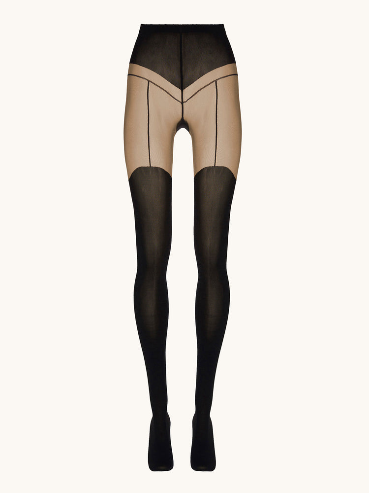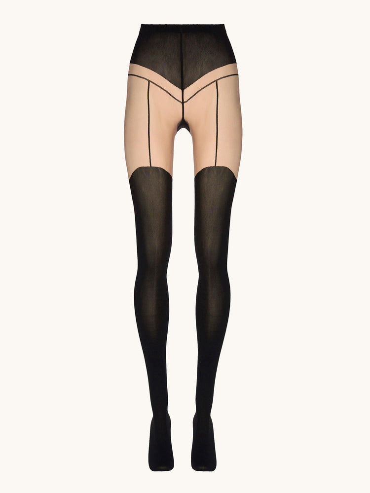 These circular-knit tights feature contrasting panels that create a stunning garter belt illusion, with a soft knitted-in waistband for a secure and comfortable fit. The sheer-opaque knitting technique offers a sensual, sophisticated look.