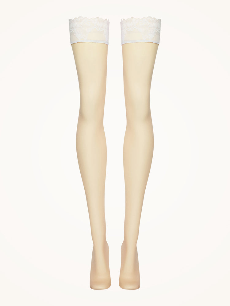 These ultra-sheer stay-ups feature a delicate lace band and a natural, unreinforced toe for a seamless look. The nude shade and sustainable dye create a flawless, feminine finish.