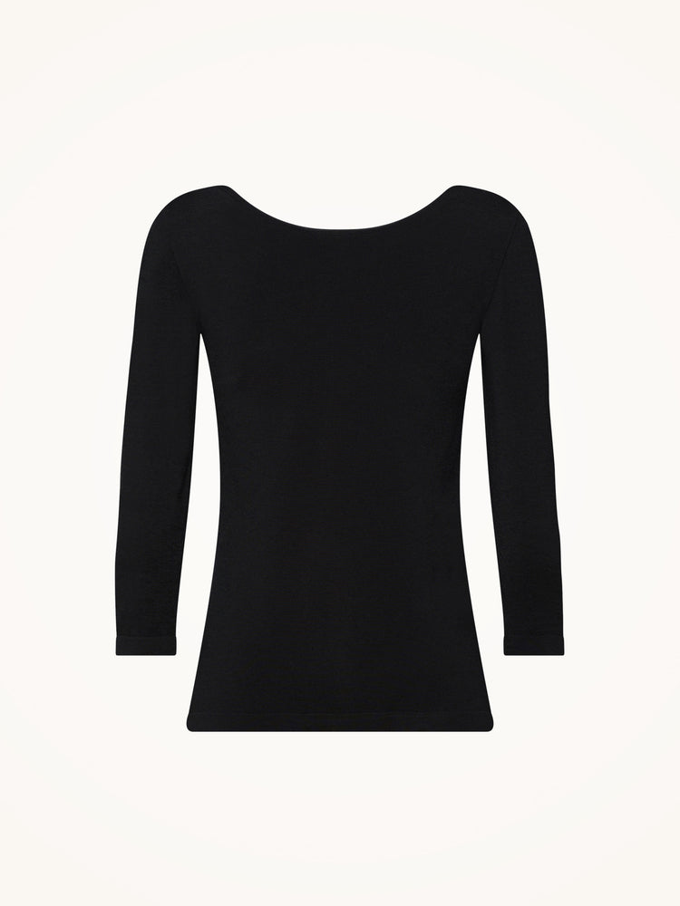 Form fit silhouette that gently follows your curves, crafted from a soft, opaque natural material with a delicate shimmer. The neckline features a semi-sheer elastic band, and the three-quarter sleeves add a touch of refined casualness.
