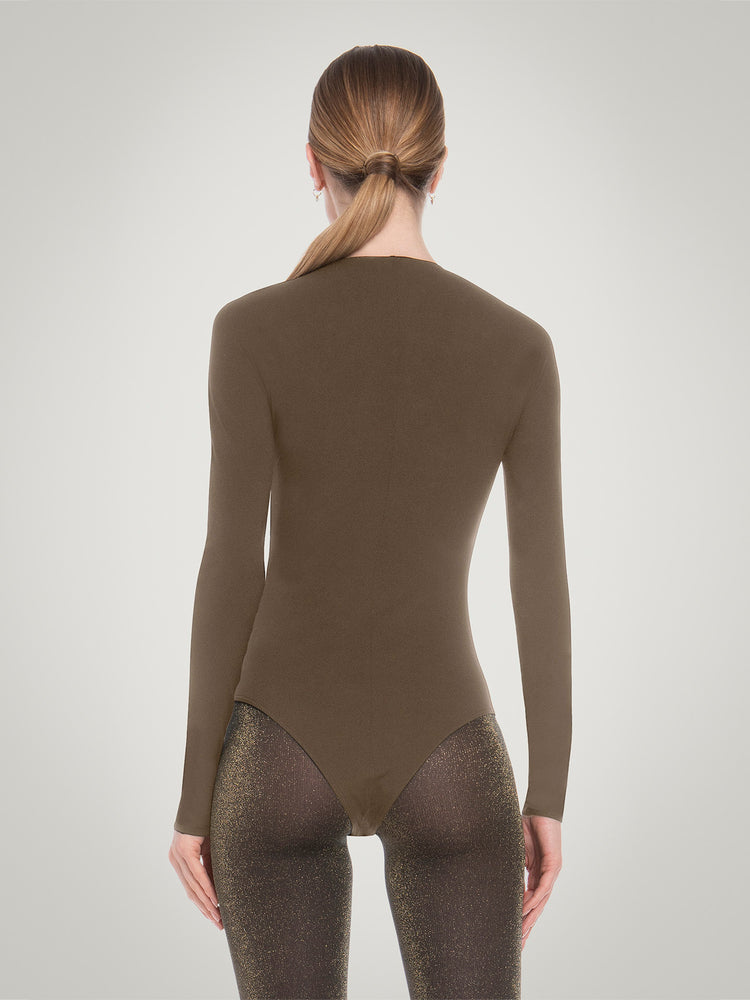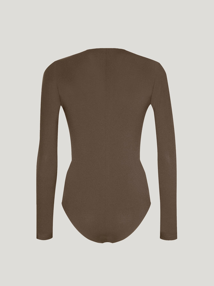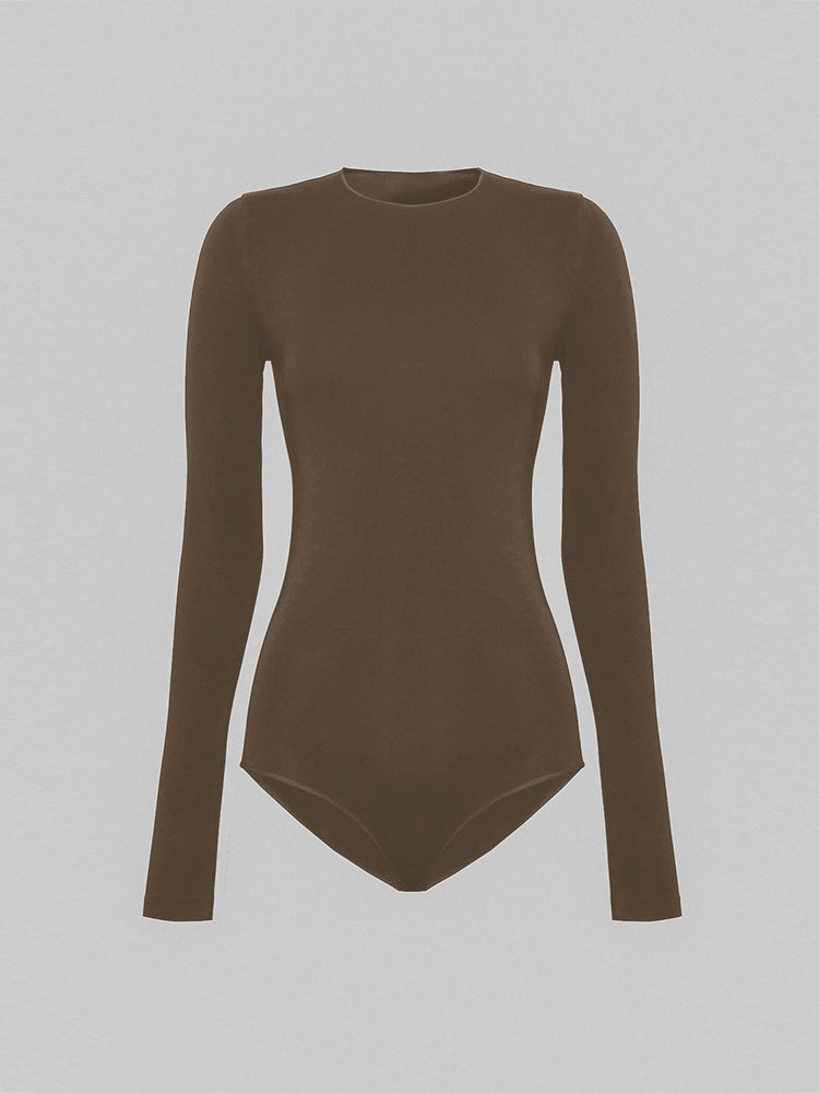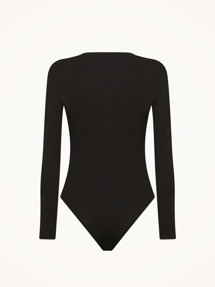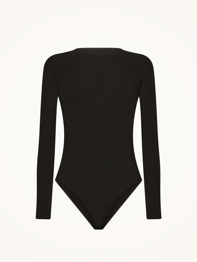 This soft jersey bodysuit highlights your figure with a semi-sheer material, featuring long sleeves and a round neckline for a sleek, minimal look. The bottom has a high, Brazilian cut for a flattering silhouette.