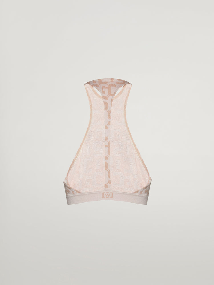 This form-fitting crop top features a bold all-over monogram pattern with subtle shiny thread details, crafted from a signature circular knit for a smooth, second-skin feel. The sleeveless design and secure fitted waistband ensure it stays perfectly in place.