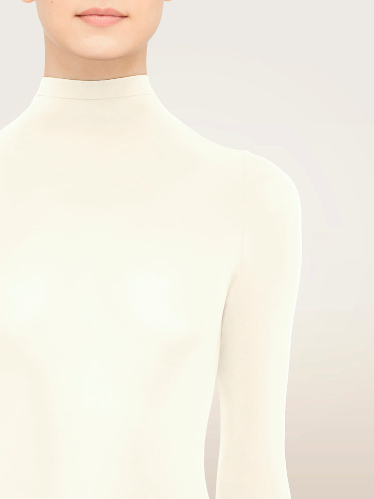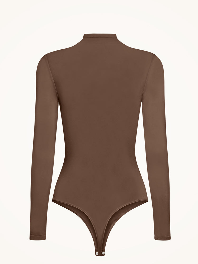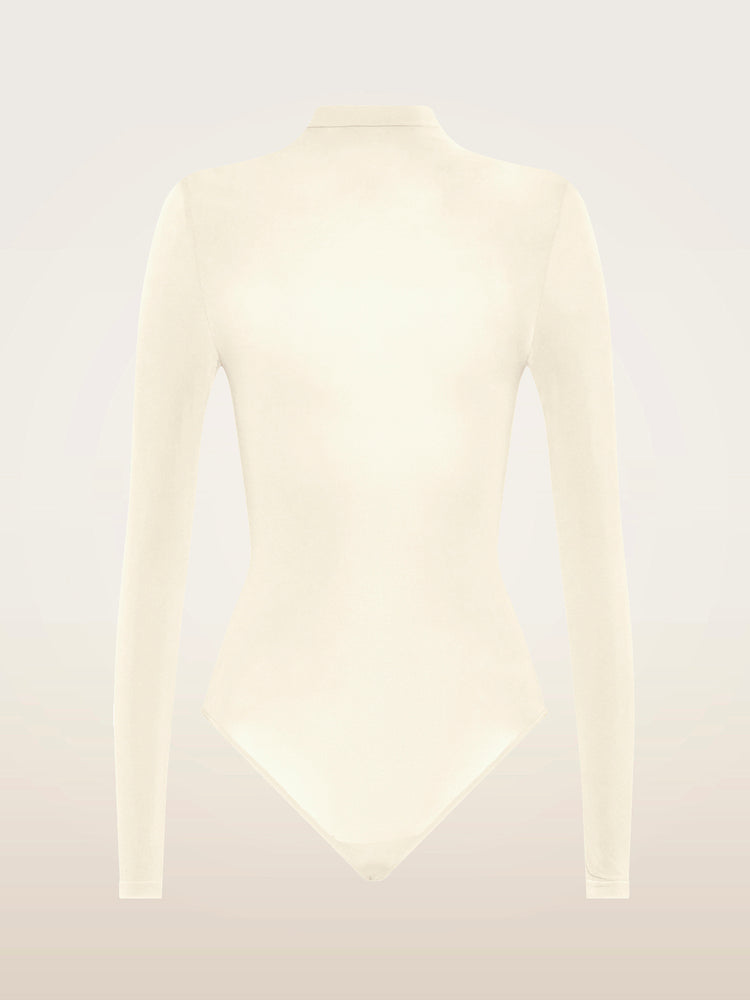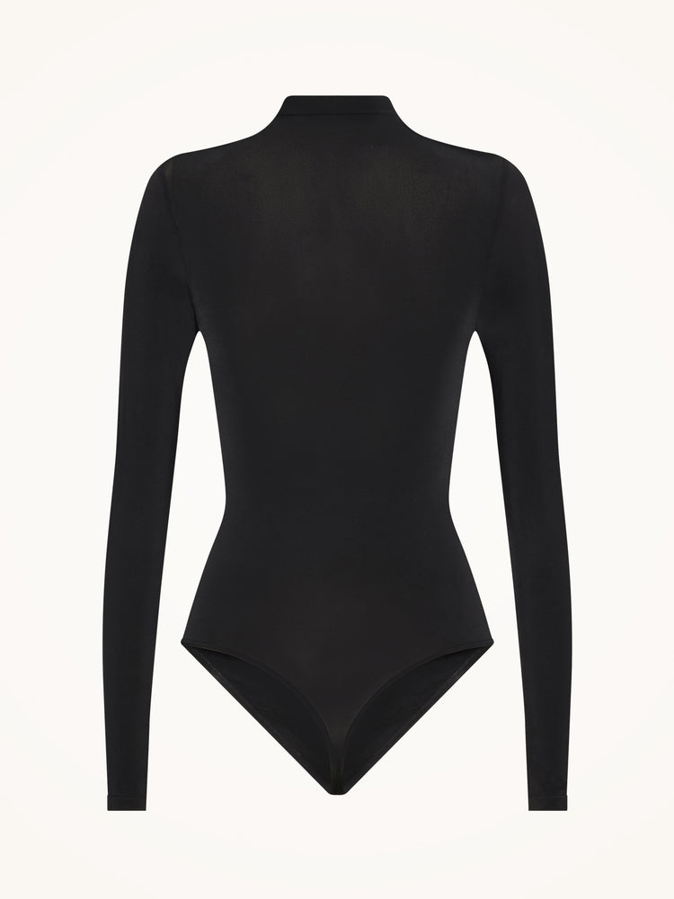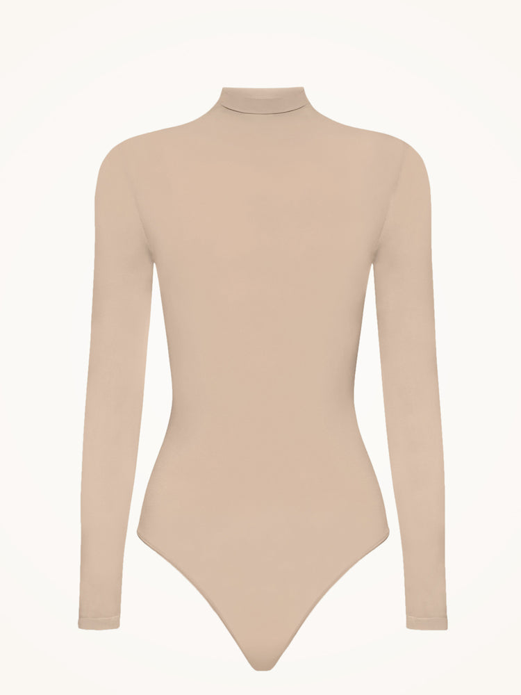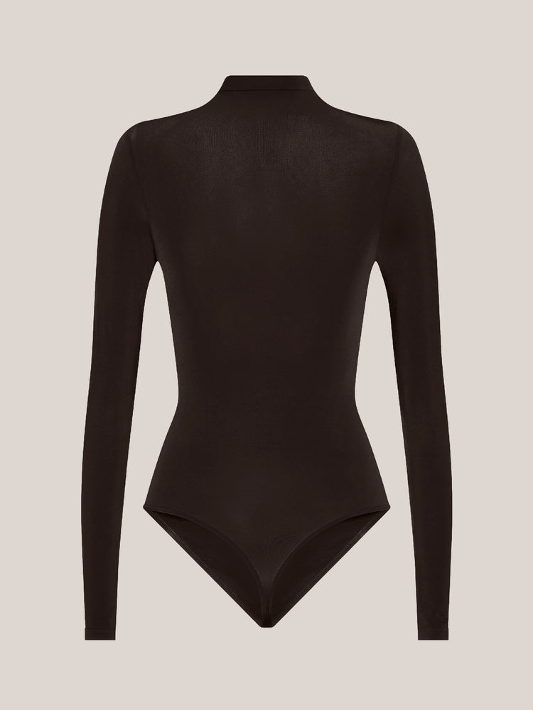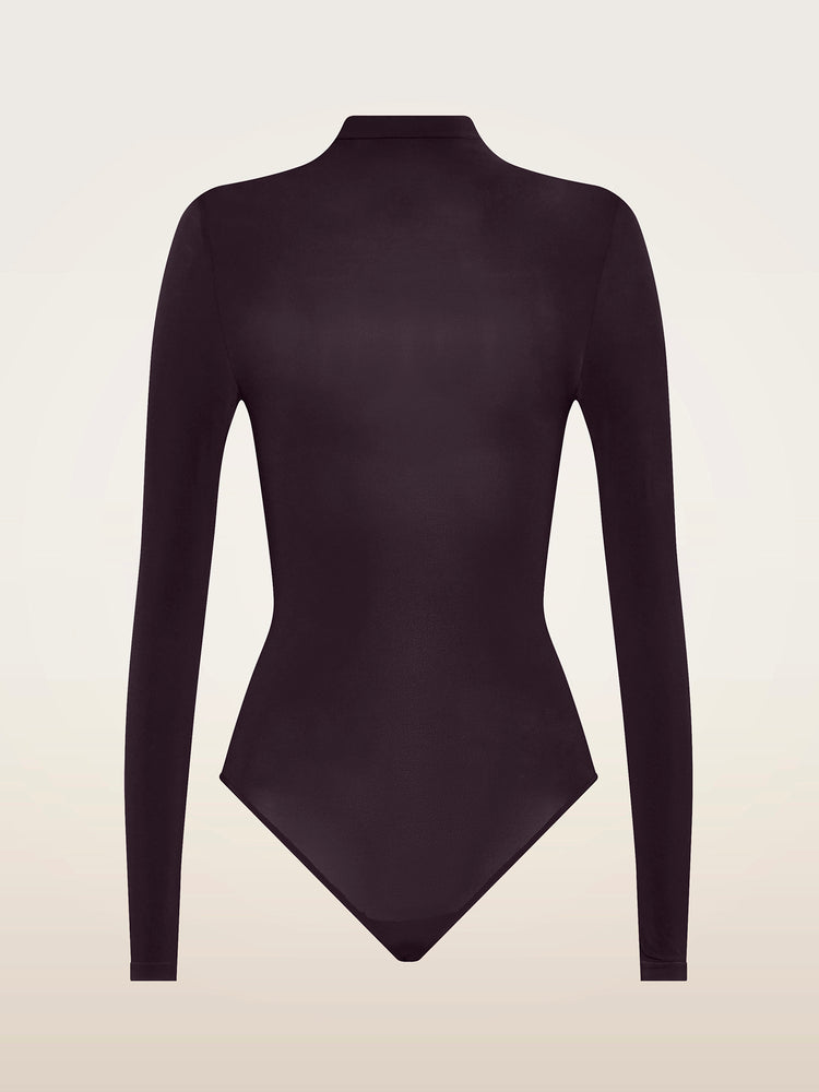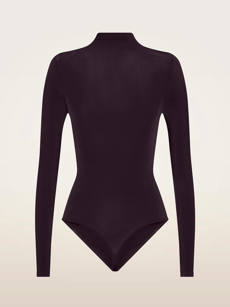 This semi-shiny, sheer bodysuit features a figure-hugging second-skin knit with a high turtleneck and long sleeves, creating a seamless, sleek silhouette. It fastens with snaps at the gusset for a smooth fit and is colored with sustainable dyes.