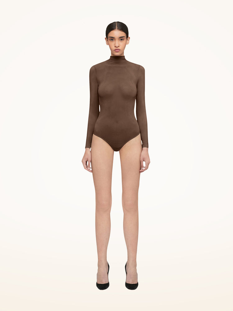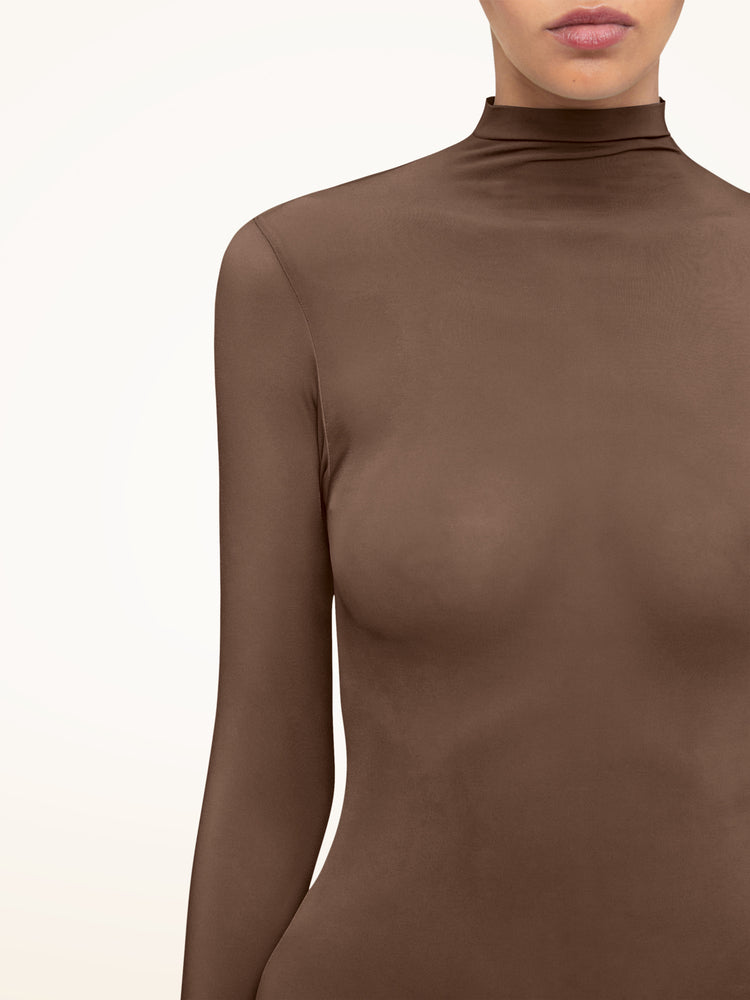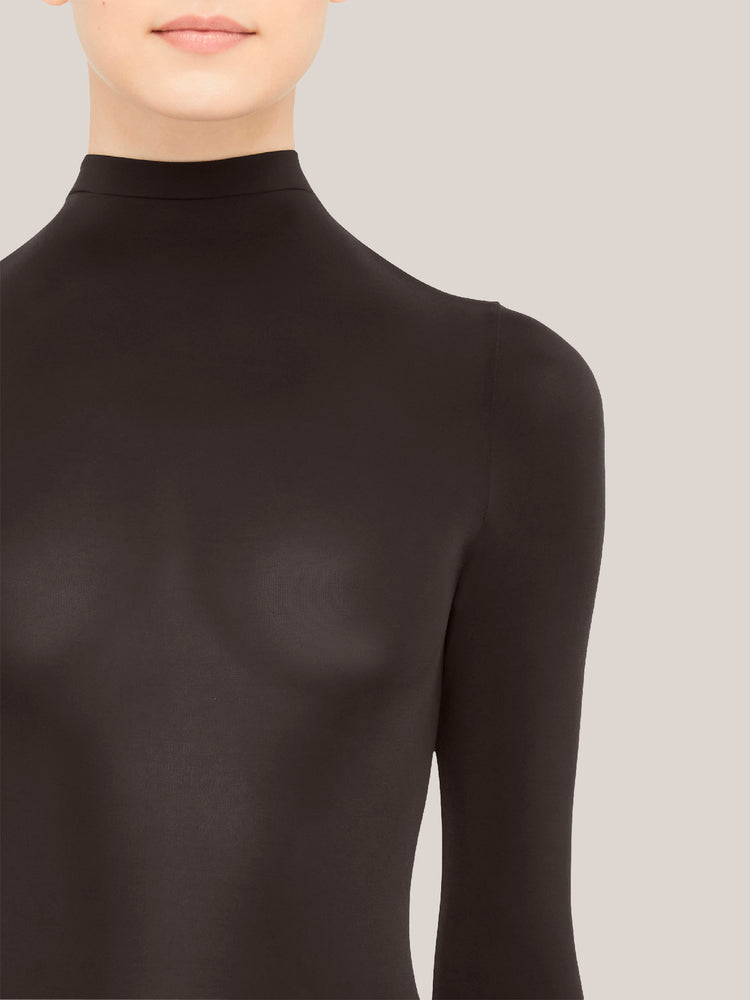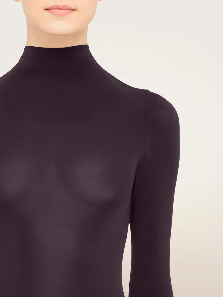 This semi-shiny, sheer bodysuit features a figure-hugging second-skin knit with a high turtleneck and long sleeves for a sleek, seamless silhouette. It fastens with snaps at the gusset for a secure fit and is colored with sustainable dyes.