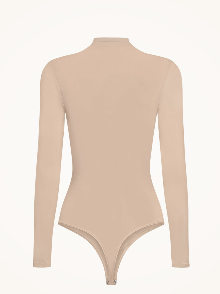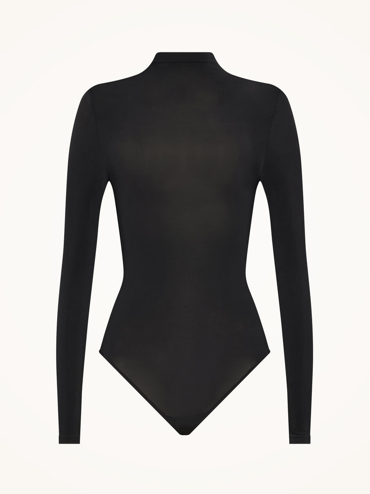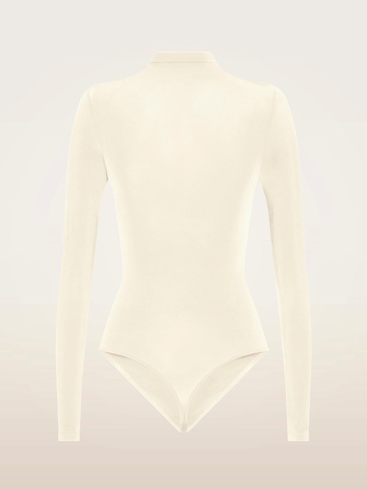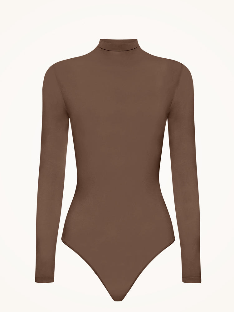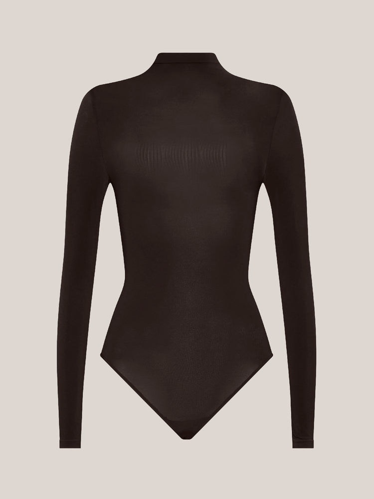 This semi-shiny, sheer bodysuit features a figure-hugging second-skin knit with a high turtleneck and long sleeves for a sleek, seamless silhouette. It fastens with snaps at the gusset for a secure fit and is colored with sustainable dyes.