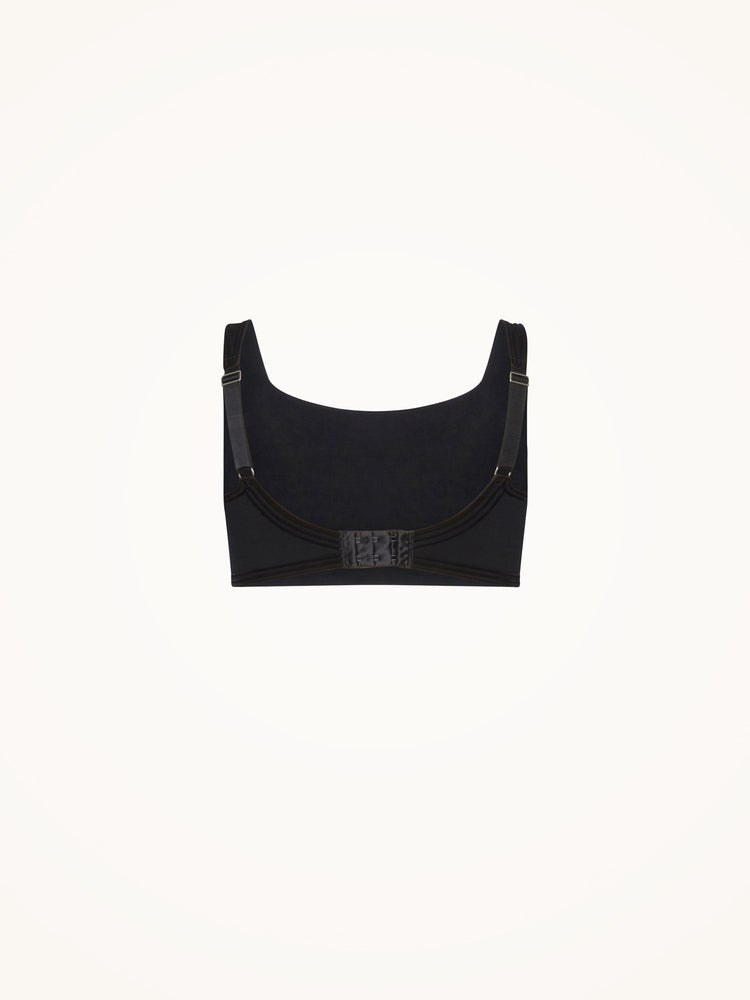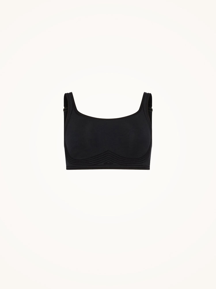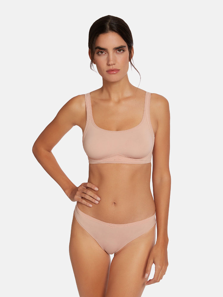 This bra features a new technique with a velvety, reinforced edge for a sleek silhouette. It has adjustable wide straps, molded soft cups, and innovative flocked silicone strips that provide gentle support without underwire. The two-ply Cotton Contour material, made from a blend of cotton and elastane, ensures a particularly comfortable and breathable fit.