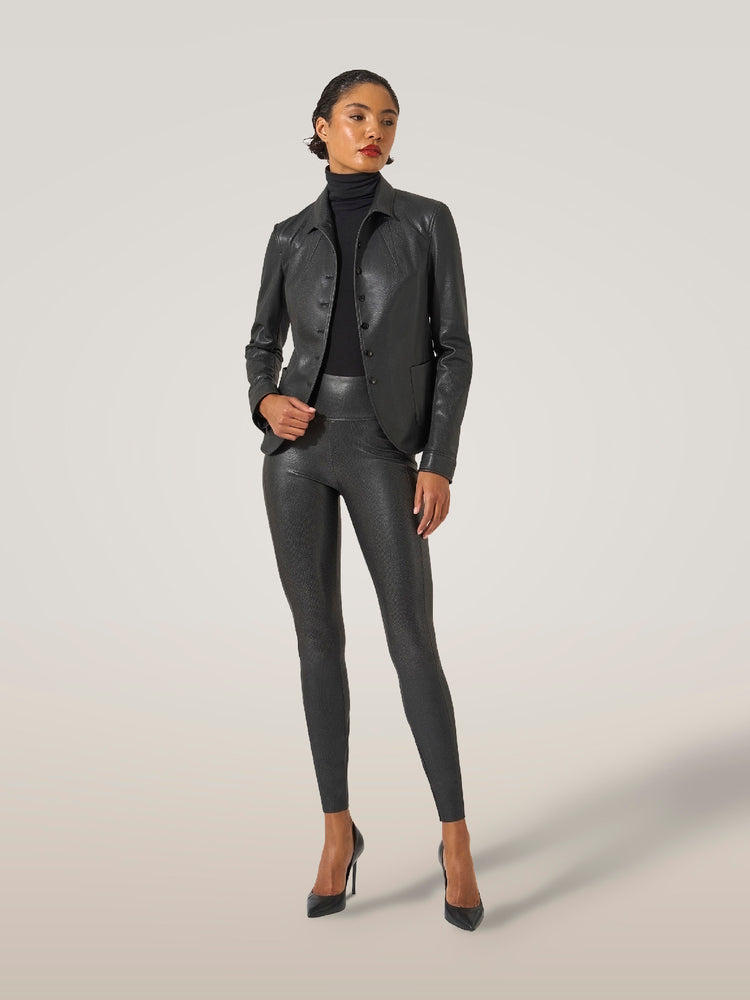 Crafted from stretchable faux leather with an embossed snakeskin texture, these leggings offer a light shaping effect on the waist and bottom. The updated slim fit, vertical leg seams, and comfortable wide waistband work together to flatter and elongate your figure for a flawless, form-fitting look.