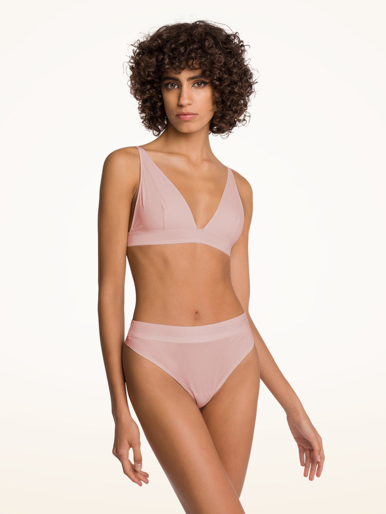 An innovative natural ribbed fabrication that is soft and feels good against the skin. Offered in a neutral color palette, modern shapes and features embossed logo elastics. A classic thong cut with bonded leg lines for a modern and clean finish.