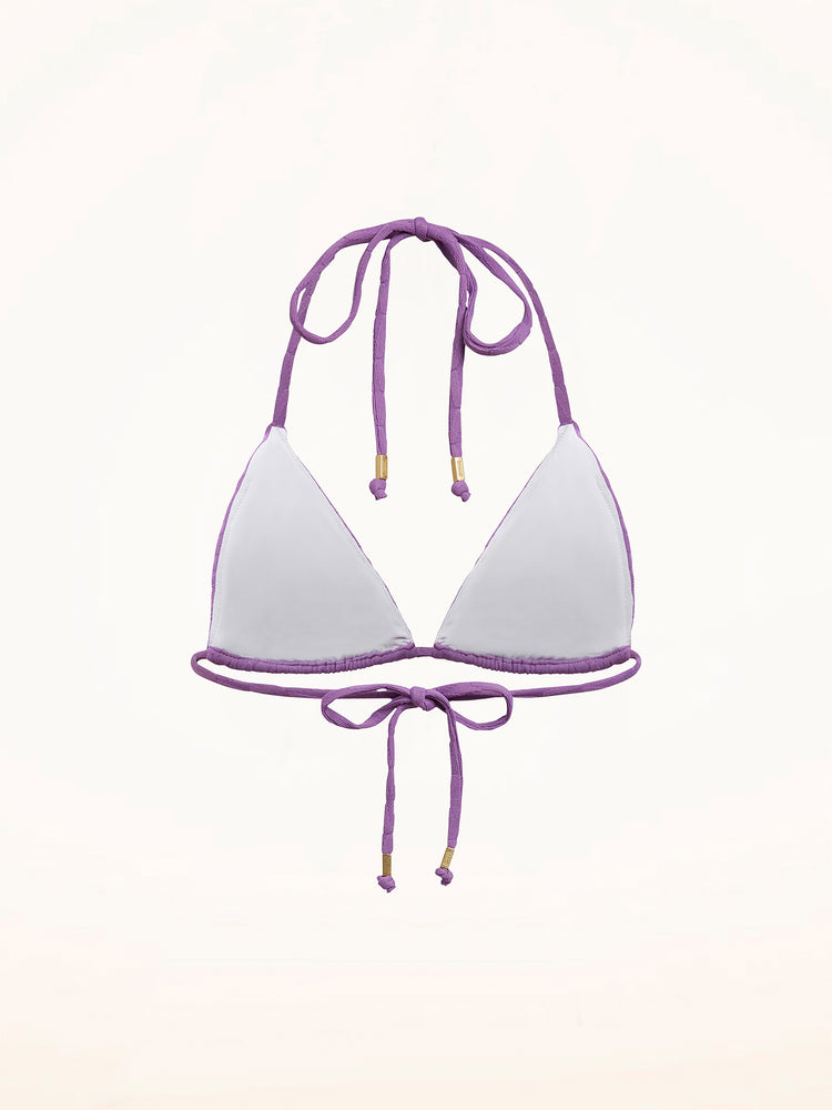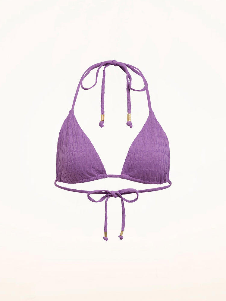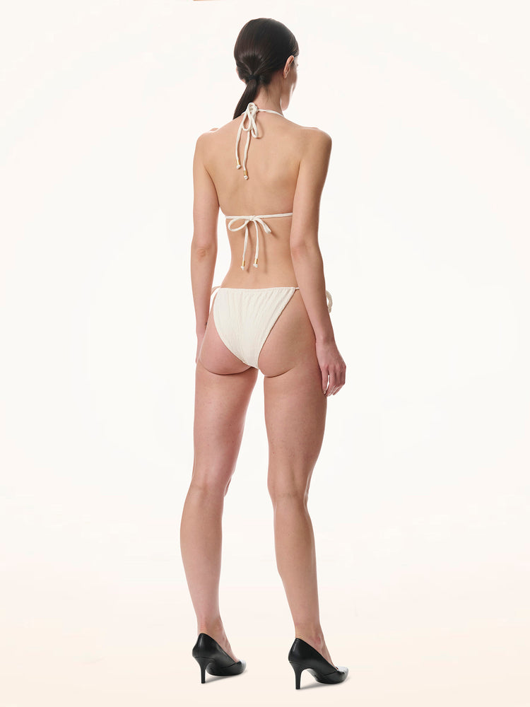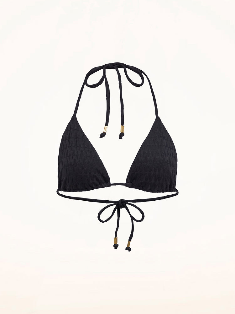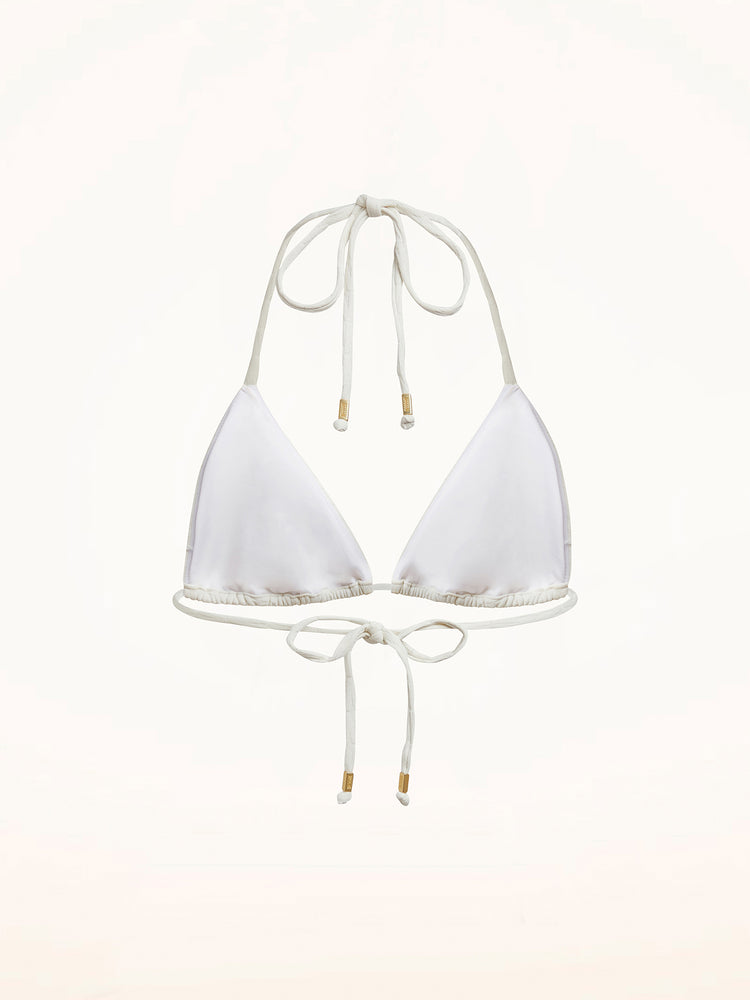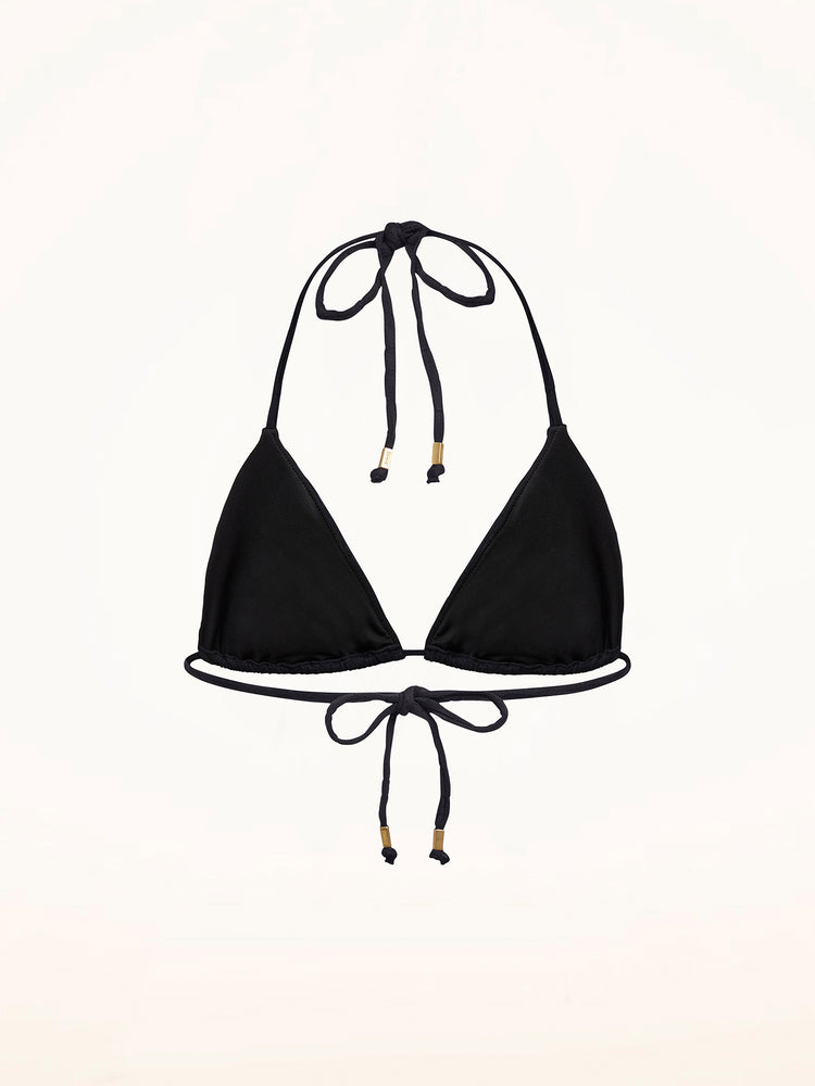 This bikini top features a tie neck and criss-cross back closure for a customized fit, with ruching detail at the cups and delicate gold beads at the end of each tie. It is unpadded and crafted from a polyamide and elastane blend for comfort and stretch.
