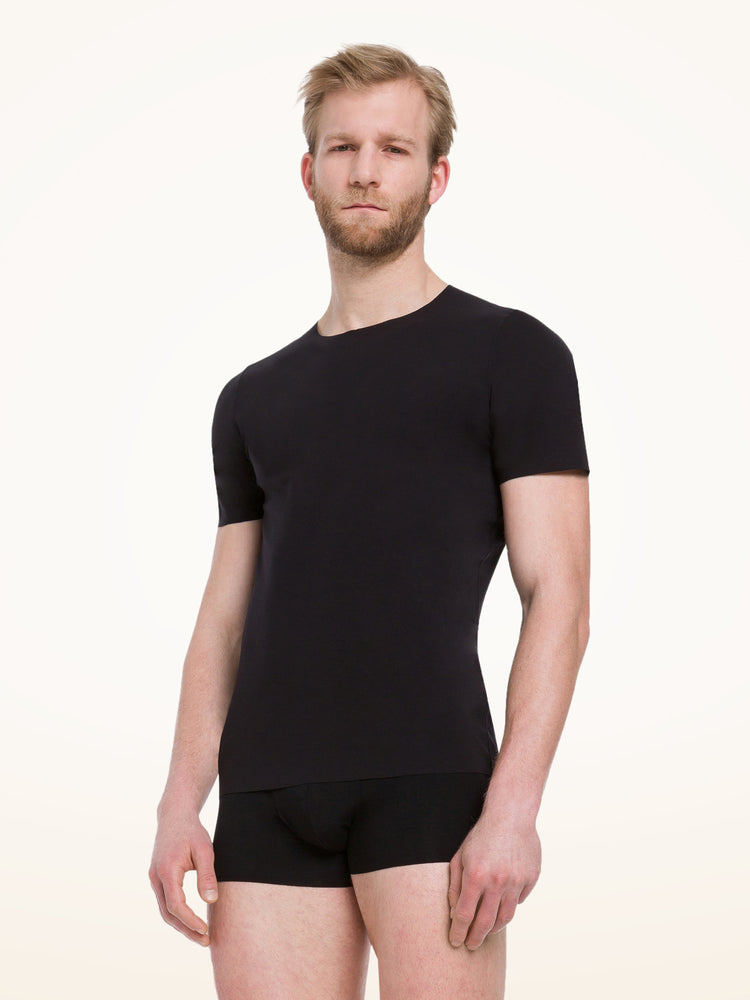 Crafted from a soft modal and elastane blend, this tee offers a sleek, breathable fit that moves with you. Its pure design and flat seams make it a versatile foundation piece.