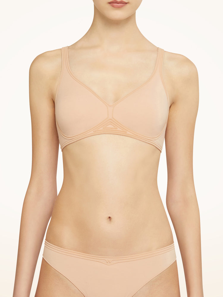 A completely new technique with velvety, reinforced selvedge makes this bra soft without sacrificing comfortable support. Flocked silicone strips assume the function of underwiring and stretchy elastic. The two-ply cotton contour material feels particularly natural against the skin. Features include adjustable straps, molded cups, and a soft cup design for a modern look and pure comfort.